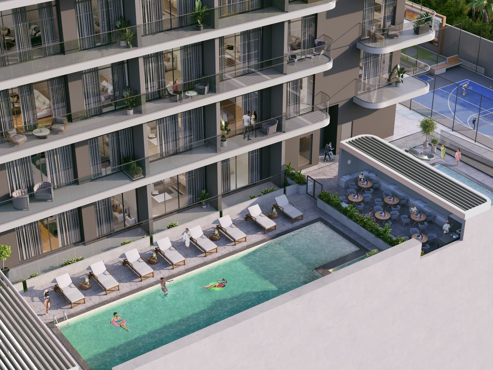 Complex infrastructure: padel tennis, pickleball courts, indoor and outdoor gyms, steam room, sauna, water playground for children, swimming pool, barbecue areas, parks for walking animals, Italian gardens, coffee shop, electric car charging stations, co-working spaces, podcast studios.