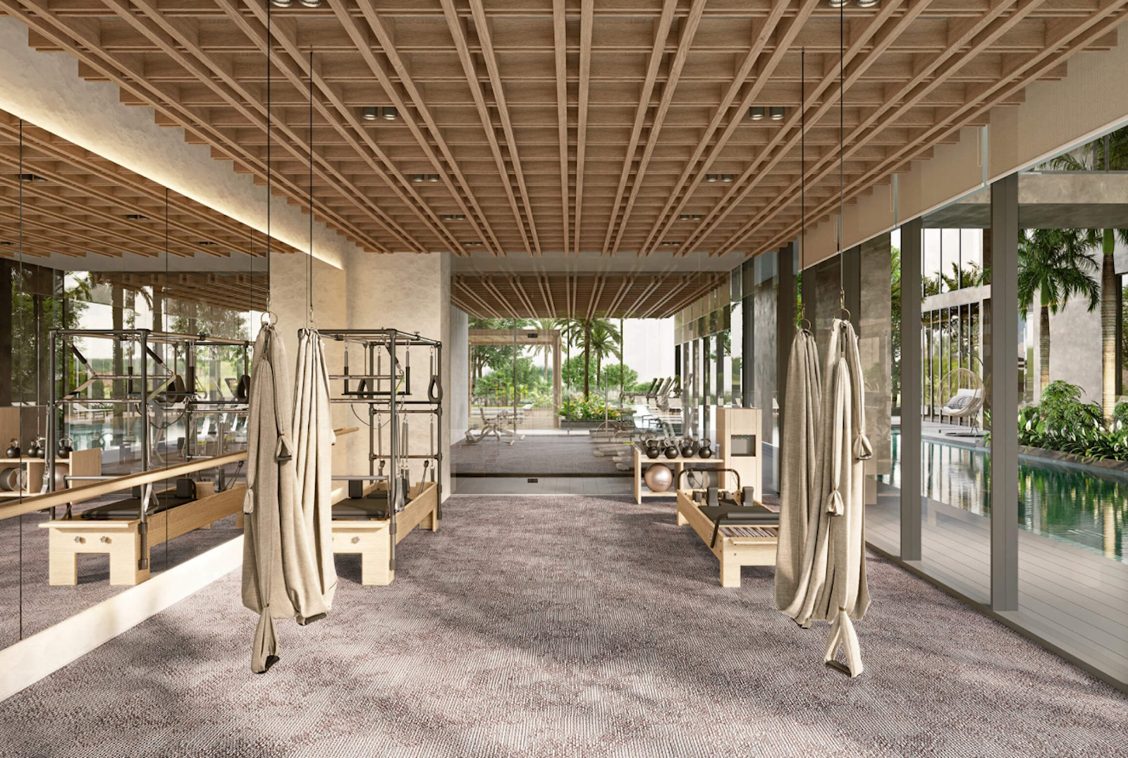 Complex infrastructure: access to crystal lagoon with lounge chair area, lobby with lounge area and communal table, retail and catering stores, movie and media room, infinity pool with canopy, indoor and outdoor children’s play areas, indoor and outdoor fitness studio, clubhouse with lounge and kitchenette, meditation nest, flotation therapy pool, spa treatments and hair salon, visiting shower room, rooftop dining and observation deck, garden with seating areas, barbecue area with outdoor dining.